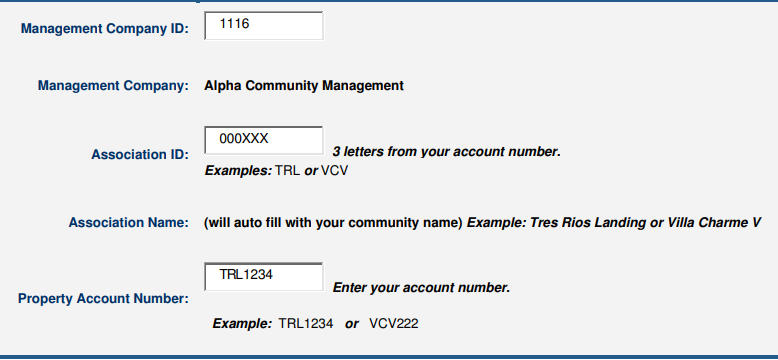 - Association Name: Will auto populate. (Examples: Tres Rios Landing or Villa Charme V)